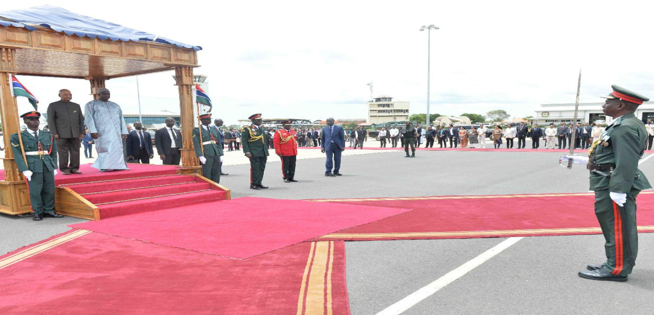 The President of India, Shri Ram Nath Kovind accorded a ceremonial welcome by the President of The Gambia, H.E. Mr. Adama Barrow, at Banjul Airport, The Gambia on July 30, 2019.