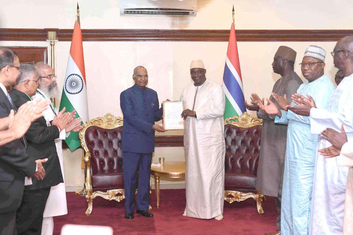 The President of India, Shri Ram Nath Kovind receives the instrument of ratification of the International Solar Alliance Framework Agreement from the President of The Gambia, H.E. Mr. Adama Barrow, at State House, in Banjul, The Gambia on July 31, 2019.