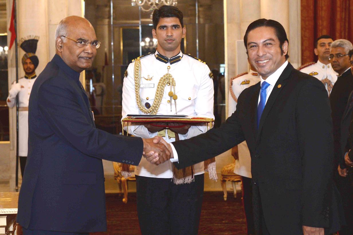 The Ambassador-designate of the Republic of El Salvador, H.E. Mr. Ariel Andrade Galindo presenting his credentials to the President of India, Shri Ram Nath Kovind, at Rashtrapati Bhavan on July 11, 2018.