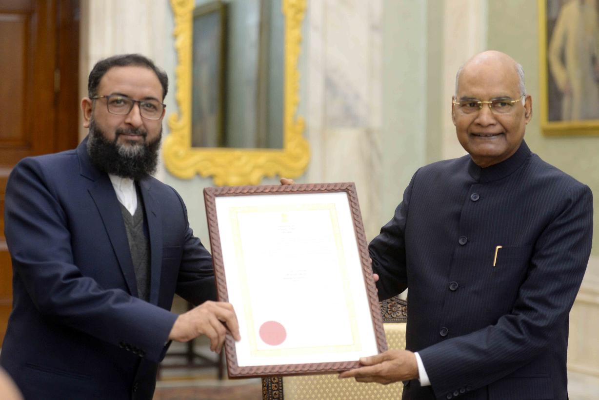 The President of India, Shri Ram Nath Kovind presenting Visitor s Award for Research in Biological Sciences jointly to Prof. Asad Ullah Khan from the Inter-disciplinary Biotechnology Unit, Aligarh Muslim University and Dr. Partima from the Special Centre for Nanoscience, Jawaharlal Nehru University, at Rashtrapati Bhavan on December 17, 2019.