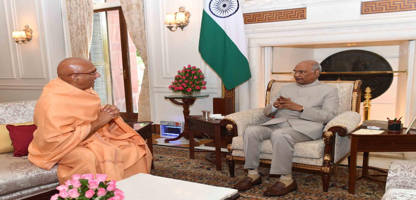 Swami Avdheshanand Giri Ji Maharaj, Acharya Mahamandaleshwar of the Juna Akhara meeting with the President of India, Shri Ram Nath Kovind, at Rashtrapati Bhavan on June 03, 2019.