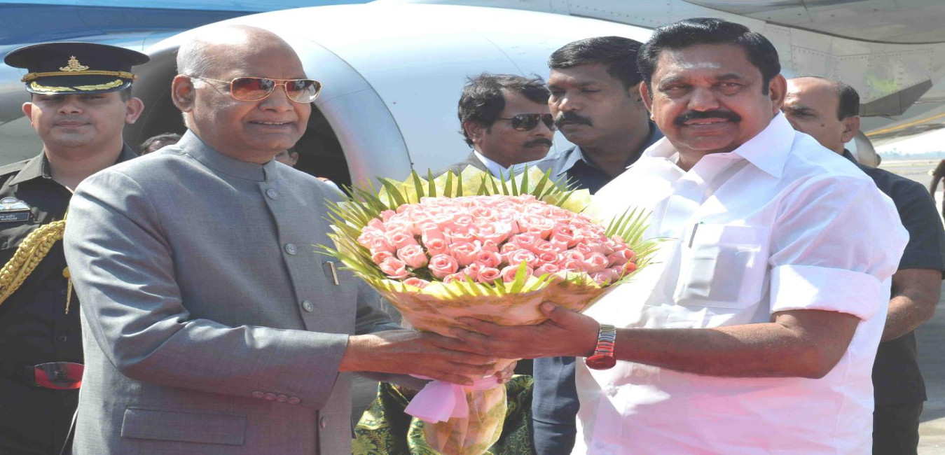 The President of India, Shri Ram Nath Kovind being received by the Governor, Tamil Nadu, Shri Banwarilal Purohit, the Chief Minister, Tamil Nadu, Shri Edappadi K. Palaniswami and the Dy. Chief Minister, Tamil Nadu, Shri O. Panneerselvam, in Chennai on February 21, 2019.