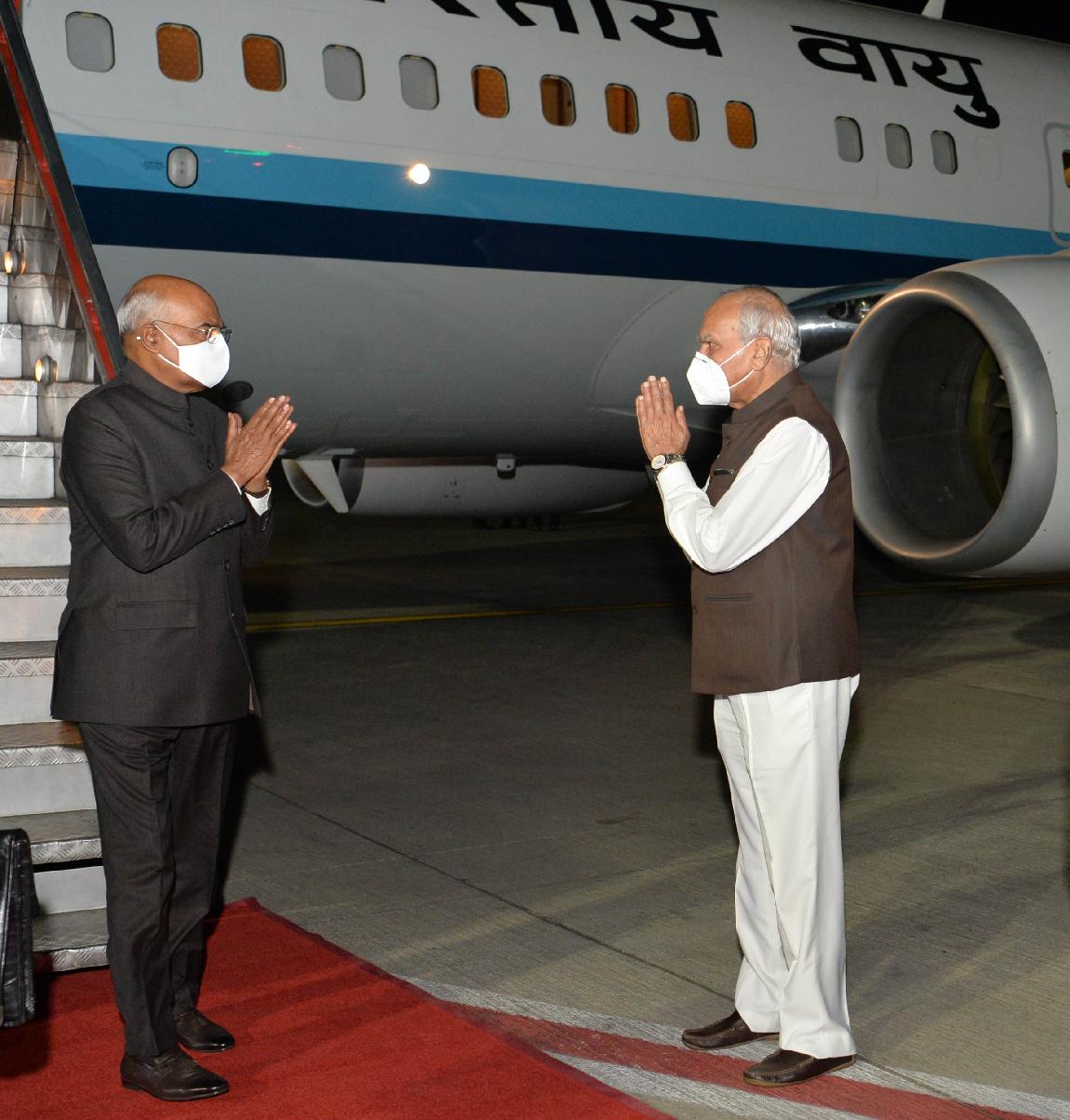 The President of India, Shri Ram Nath Kovind being received by the Governor of Tamil Nadu, Shri Banwarilal Purohit, on his arrival, in Chennai airport on March 09, 2021.