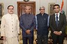 The Chairman, EAC-PM & Member, NITI Aayog, Shri Bibek Debroy, the Director, Syama Prasad Mookerjee Research Foundation, Dr. Anirban Ganguly and the OSD, NITI Aayog, Shri Kishore Desai meeting with the President of India, Shri Ram Nath Kovind, at Rashtrapati Bhavan on November 14, 2018.