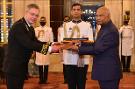 The Ambassador of the Russian Federation, H.E. Mr. Denis Evgenyevich Alipov presenting his credentials to the President of India, Shri Ram Nath Kovind, at Rashtrapati Bhavan on March 16, 2022.