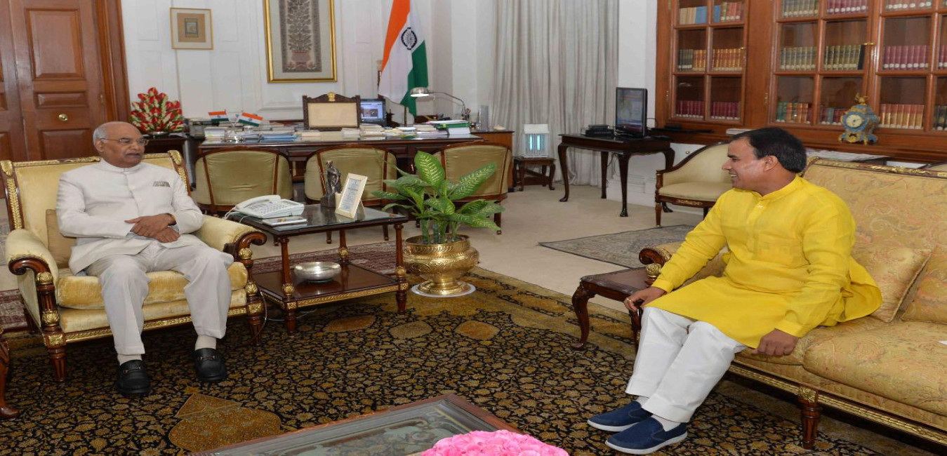 The Minister of State (IC) for Higher Education, Co-operative, Protocol & Dairy Development, Govt. of Uttrakhand, Dr. Dhan Singh Rawat meeting with the President of India, Shri Ram Nath Kovind, at Rashtrapati Bhavan on August 31, 2018.