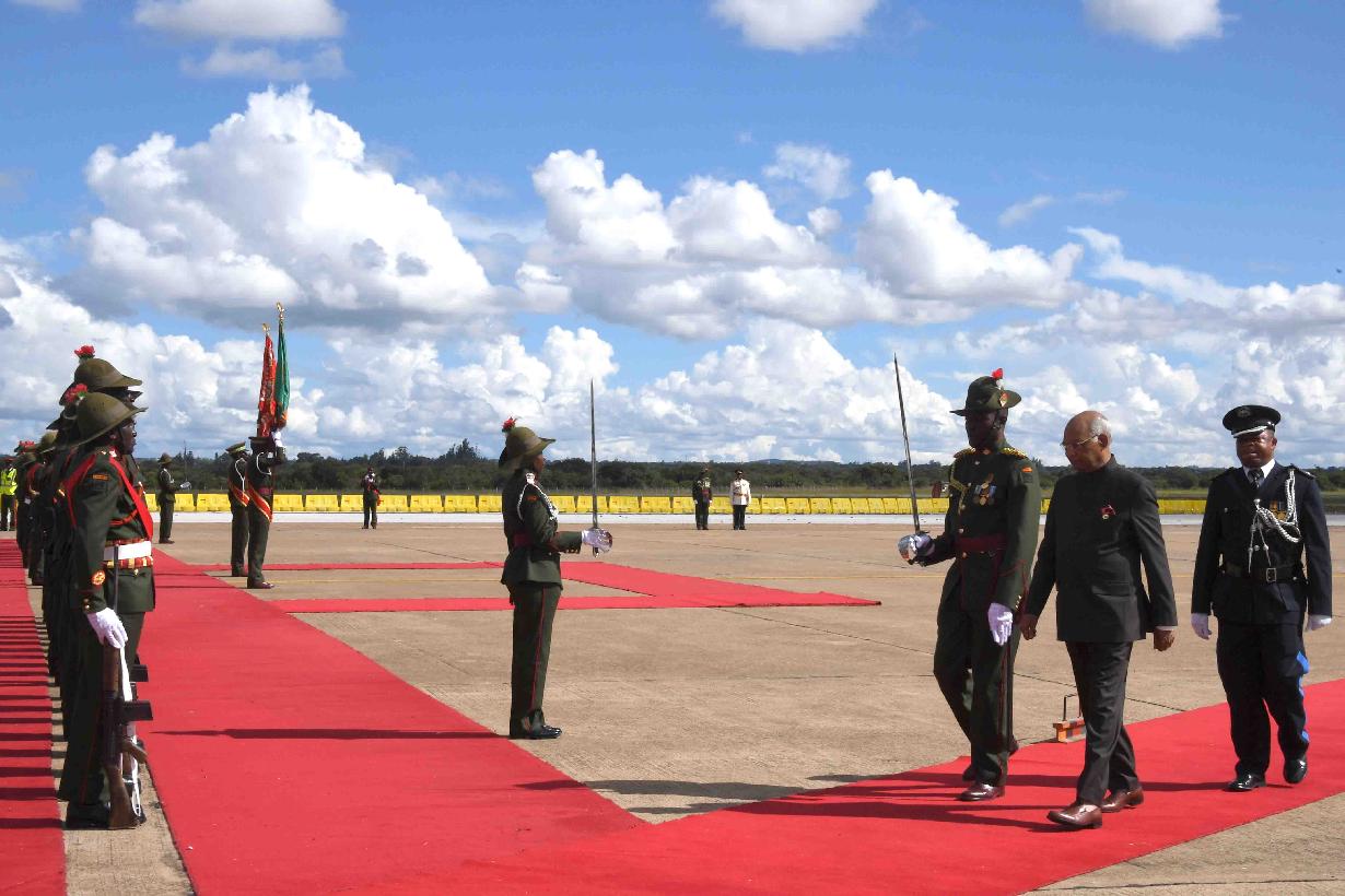 The President of India, Shri Ram Nath Kovind inspecting the Guard of Honour, on his arrival, at Kenneth Kaunda International Airport, Lusaka, in the Republic of Zambia on April 10, 2018.
