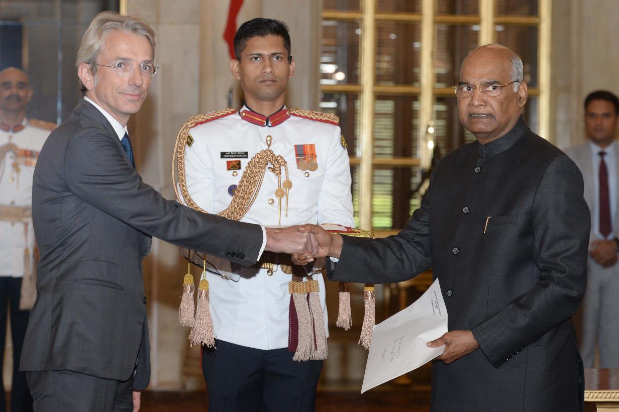 The Ambassador-designate of France, H.E. Mr. Emannuel Lenain presenting his credentials to the President of India, Shri Ram Nath Kovind, at Rashtrapati Bhavan on October 03, 2019.