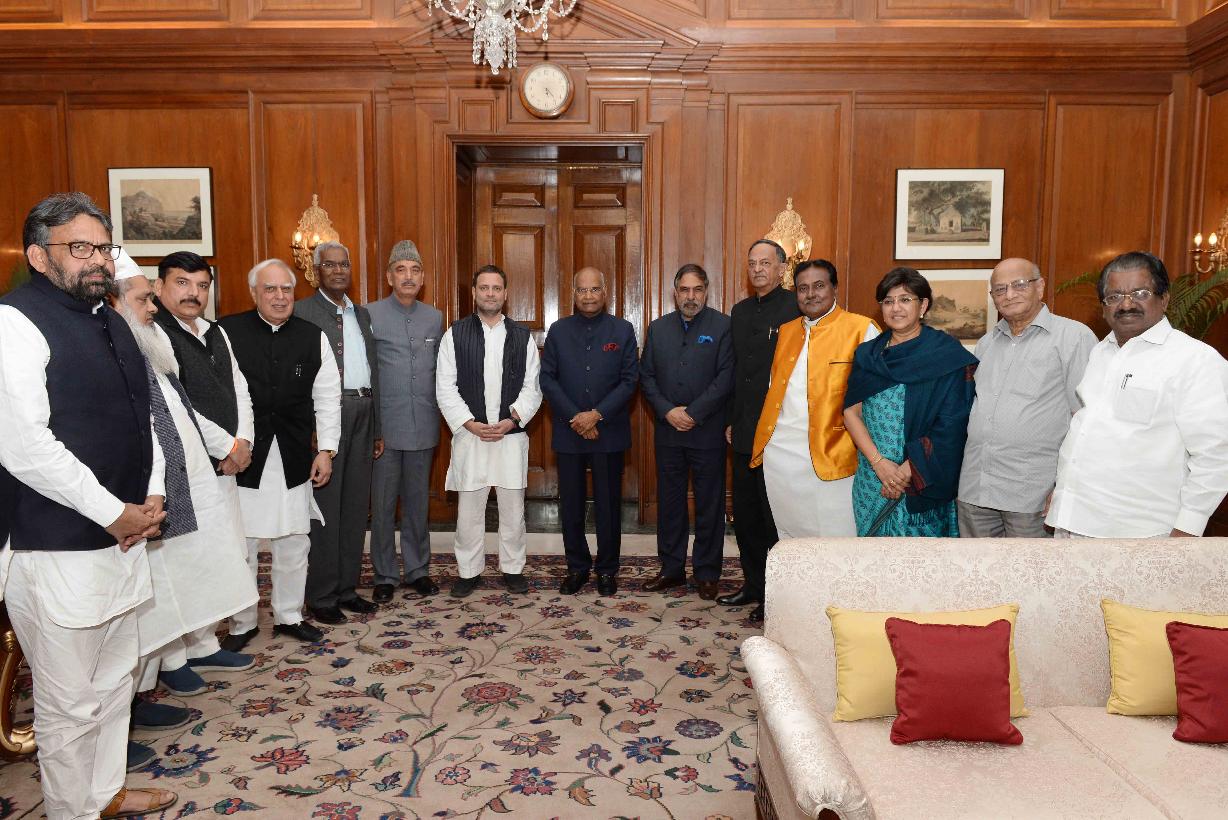 The Leader of Opposition, Rajya Sabha, Shri Ghulam Nabi Azad along with leaders of various opposition political parties meeting with the President of India, Shri Ram Nath Kovind, at Rashtrapati Bhavan on March 28, 2018.