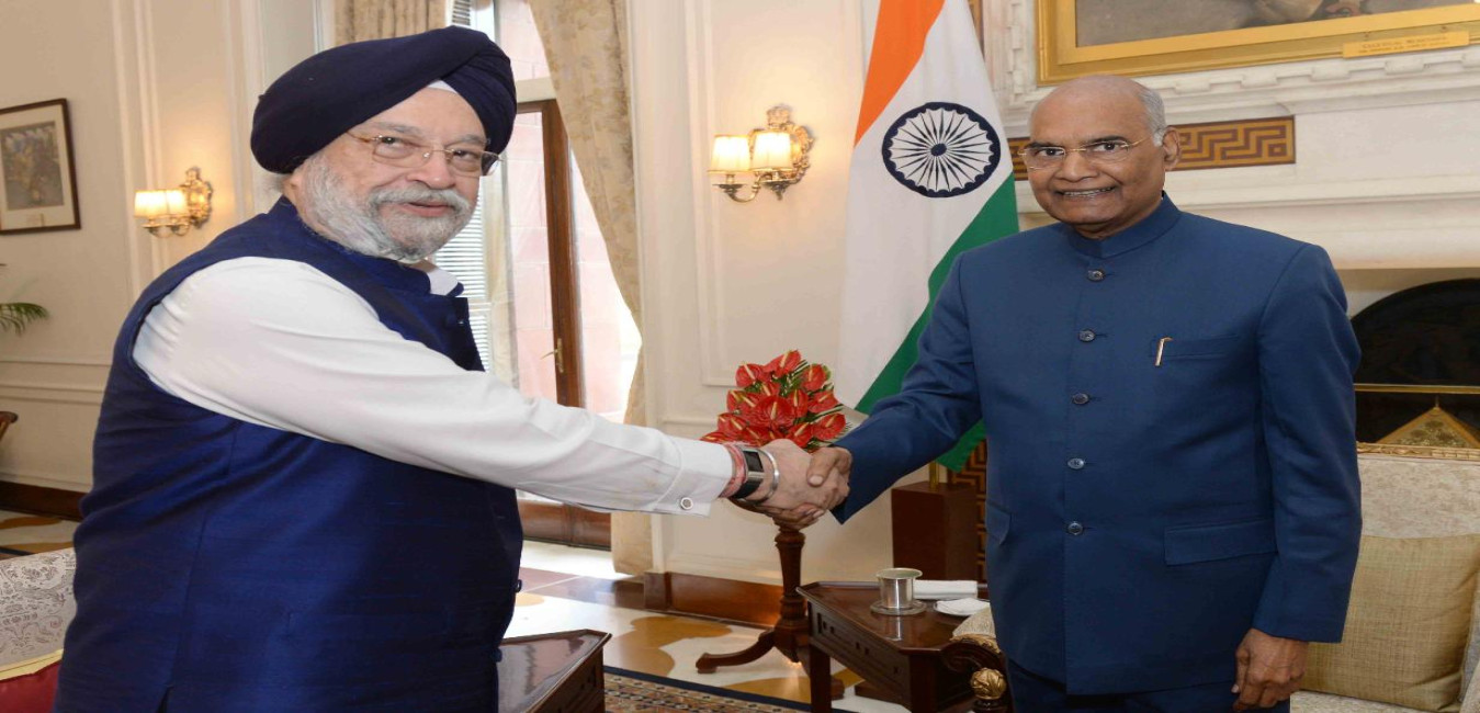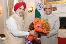 The Minister of State (Insependent Charge) for Housing & Urban Affairs and Civil Aviation and Minister of State for Commerce and Industry, Shri Hardeep Singh Puri meeting with the President of India, Shri Ram Nath Kovind, at Rashtrapati Bhavan on June 11, 2019.