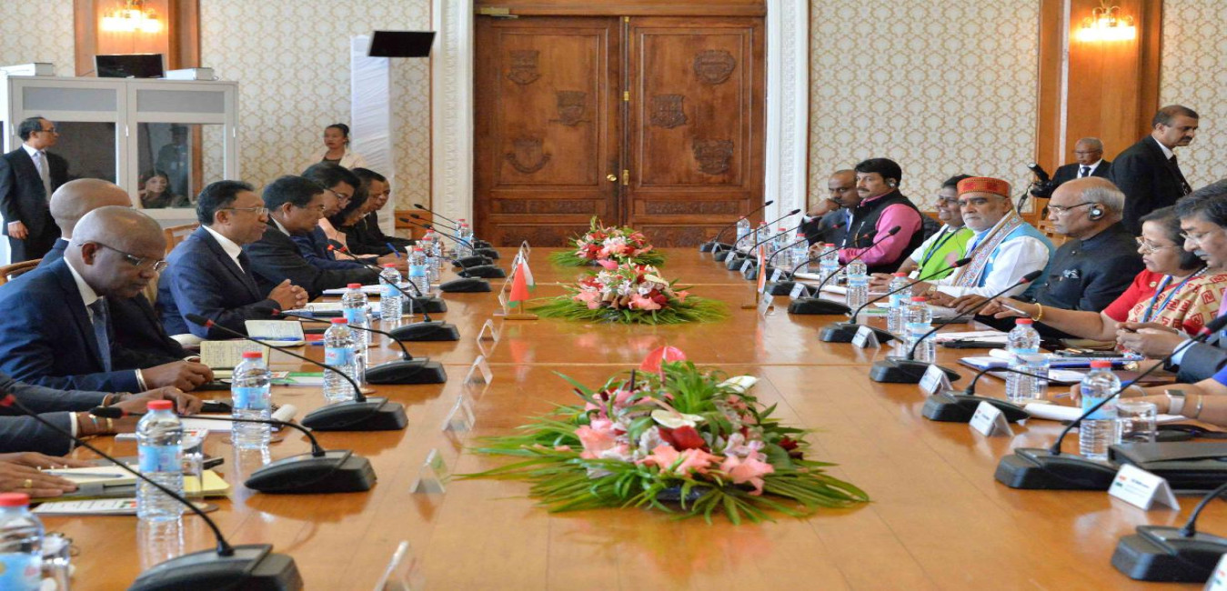 The President of India, Shri Ram Nath Kovind at the Delegation Level Talks with the President of Madagascar, H.E. Mr. Hery Rajaonarimampianina, at Presidential Lavoloha Palace, in Madagascar on March 14, 2018.