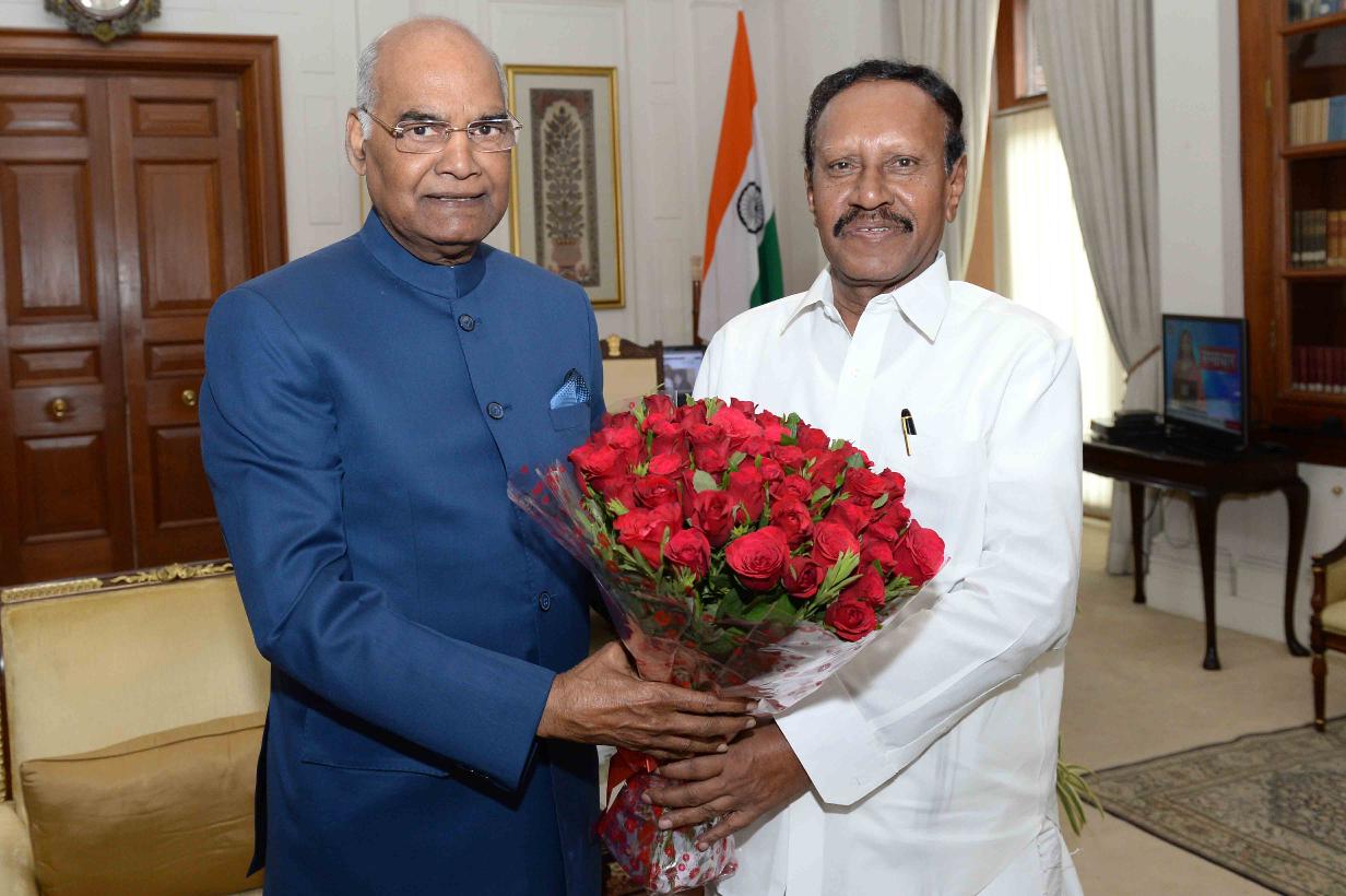 The Deputy Speaker, Lok Sabha, Dr. M. Thambidurai along with Dr. M.K. Surappa, Vice Chancellor, Anna University and others calling on the President of India, Shri Ram Nath Kovind, at Rashtrapati Bhavan on June 06, 2018.
