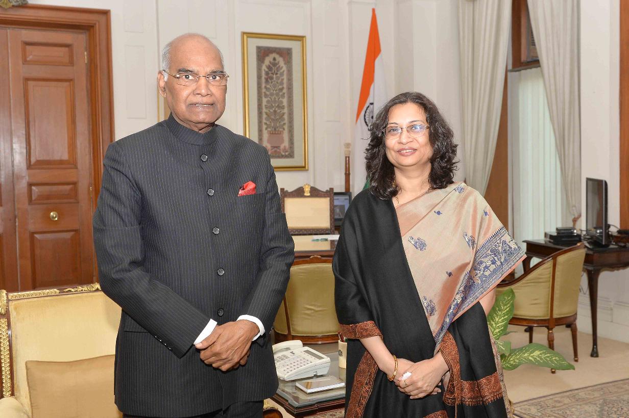 The Ambassador of India-designate to Cambodia, Smt. Manika Jain meeting with the President of India, Shri Ram Nath Kovind, at Rashtrapati Bhavan on December 06, 2017.