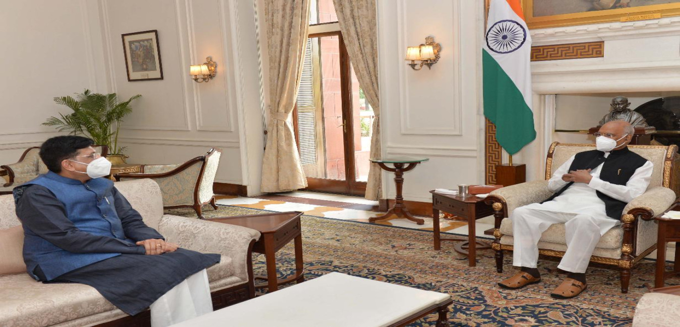 The Minister of Railways, Commerce and Industry, Shri Piyush Goyal calling on the President of India, Shri Ram Nath Kovind, at Rashtrapati Bhavan on June 15, 2021.