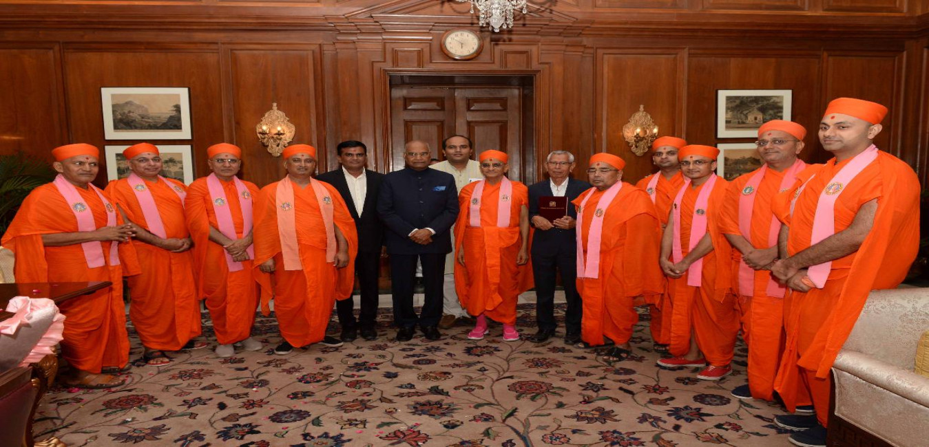 Shri Purushottampriyadasji Maharaj, Gaddipati, Shree Swaminarayan Temple Sevashram, Maninagar, Ahmedabad with others meeting with the President of India, Shri Ram Nath Kovind, at Rashtrapati Bhavan on September 27, 2017.