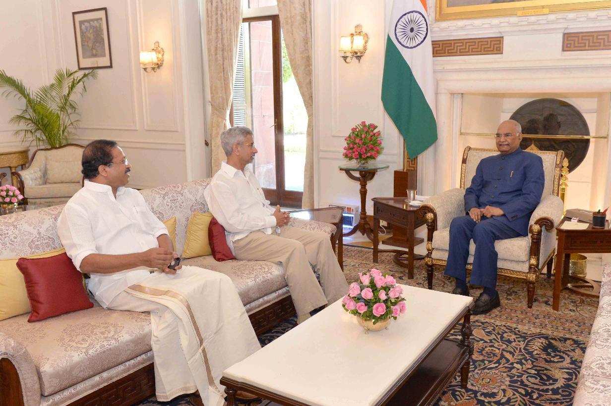 The Minister of External Affairs, Dr. S. Jaishankar along with the Minister of State for External Affairs and Parliamentary Affairs, Shri V. Muraleedharan meeting with the President of India, Shri Ram Nath Kovind, at Rashtrapati Bhavan on June 10, 2019.