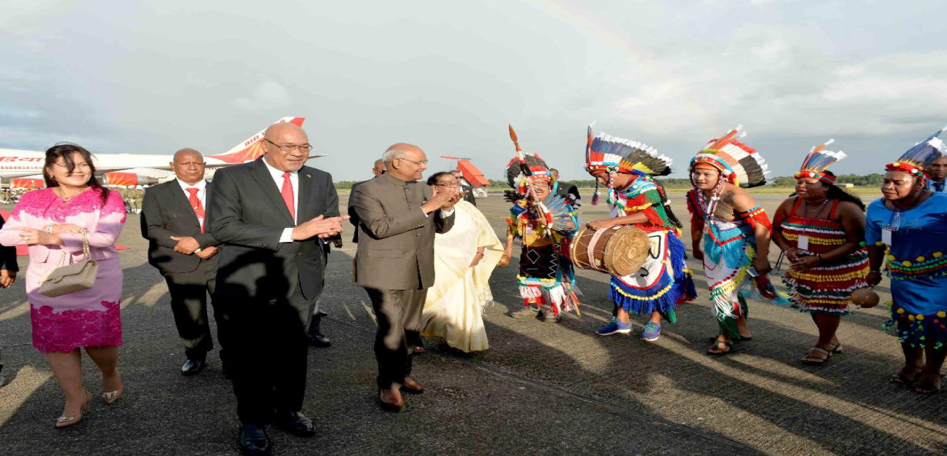 The President of India, Shri Ram Nath Kovind and the First Lady of India, Smt. Savita Kovind being received by the President of the Republic of Suriname, H.E. Mr. Desire Delano Bouterse and the First Lady of Suriname, Mrs. Ingrid Bouterse-Waldring, during the Ceremonial arrival, at Johan Adolf Pengel International Airport, Paramaribo, in Suriname on June 19, 2018.