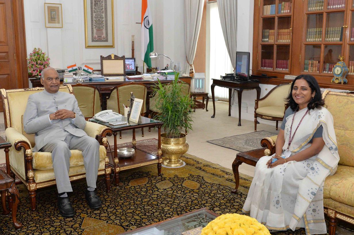 The Ambassador-designate of India to the Republic of Korea, Smt. Sripriya Ranganathan meeting with the President of India, Shri Ram Nath Kovind, at Rashtrapati Bhavan on August 01, 2018.