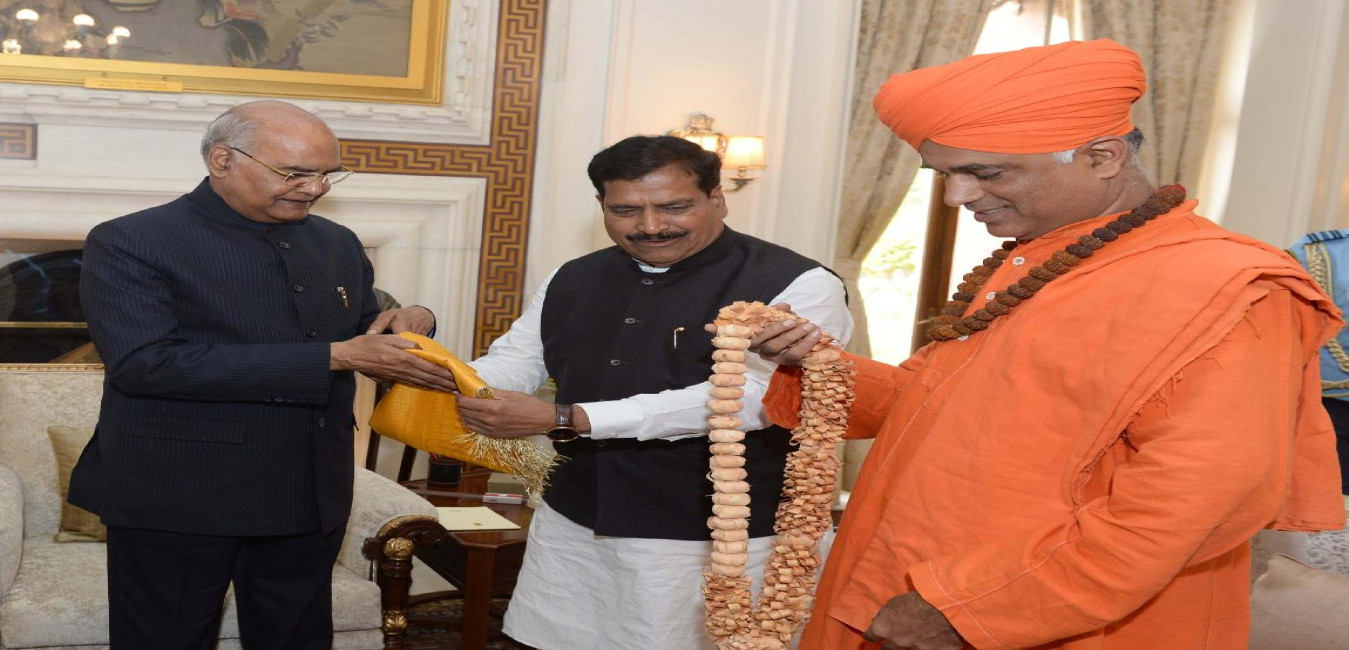 The Minister of State for Railways, Shri Suresh Chanabasappa Angadi along with Dr. Siddalinga Swamiji meeting with the President of India, Shri Ram Nath Kovind, at Rashtrapati Bhavan on November 21, 2019.