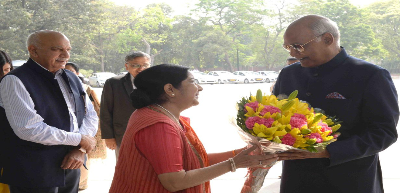 The Minister of External Affairs, Smt. Sushma Swaraj calling on the President of India, Shri Ram Nath Kovind, at Rashtrapati Bhavan on January 30, 2018.