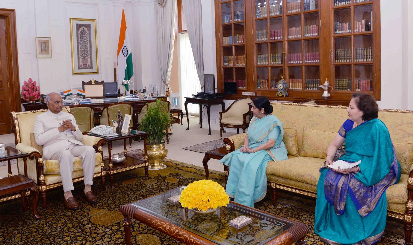 The Minister for External Affairs, Smt. Sushma Swaraj calling on the President of India, Shri Ram Nath Kovind, at Rashtrapati Bhavan on August 29, 2017.