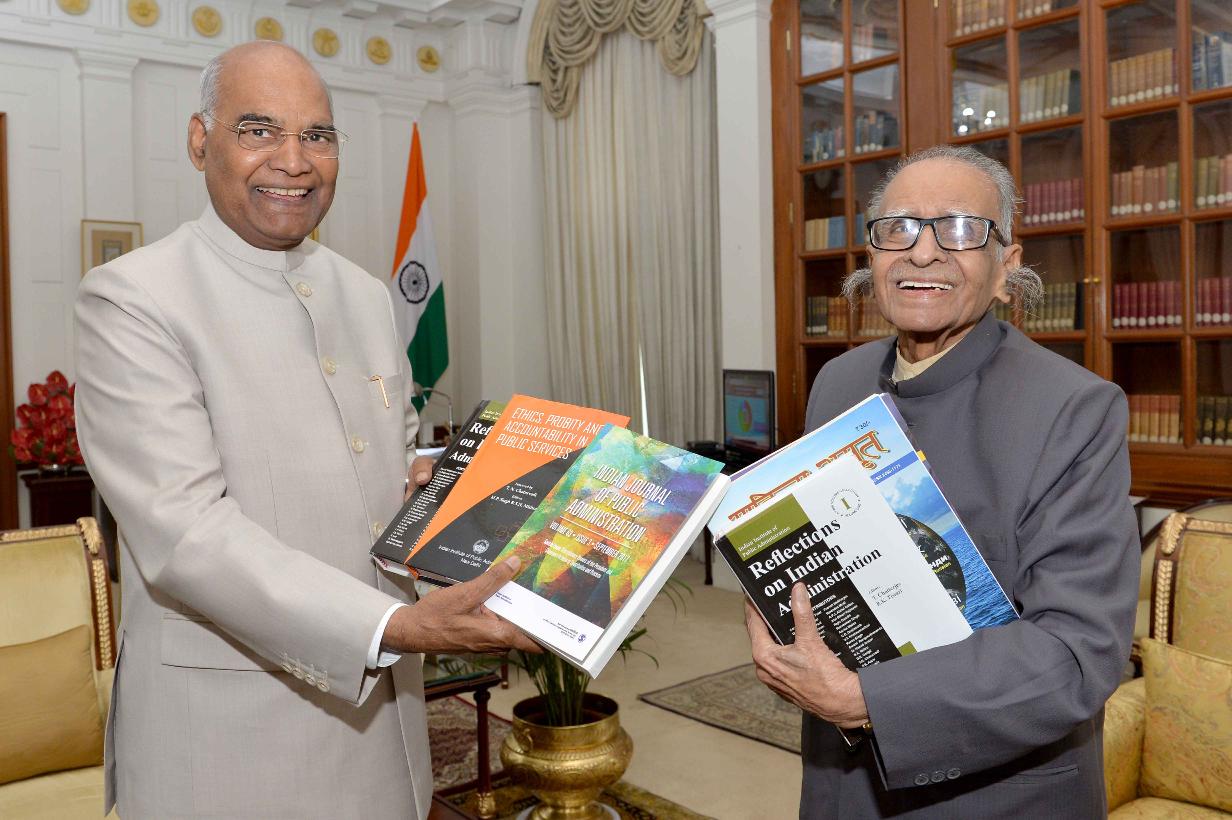 The former Governor of Karnataka, Shri T.N. Chaturvedi presenting publications of IIPA to the President of India, Shri Ram Nath Kovind, at Rashtrapati Bhavan on September 12, 2018.