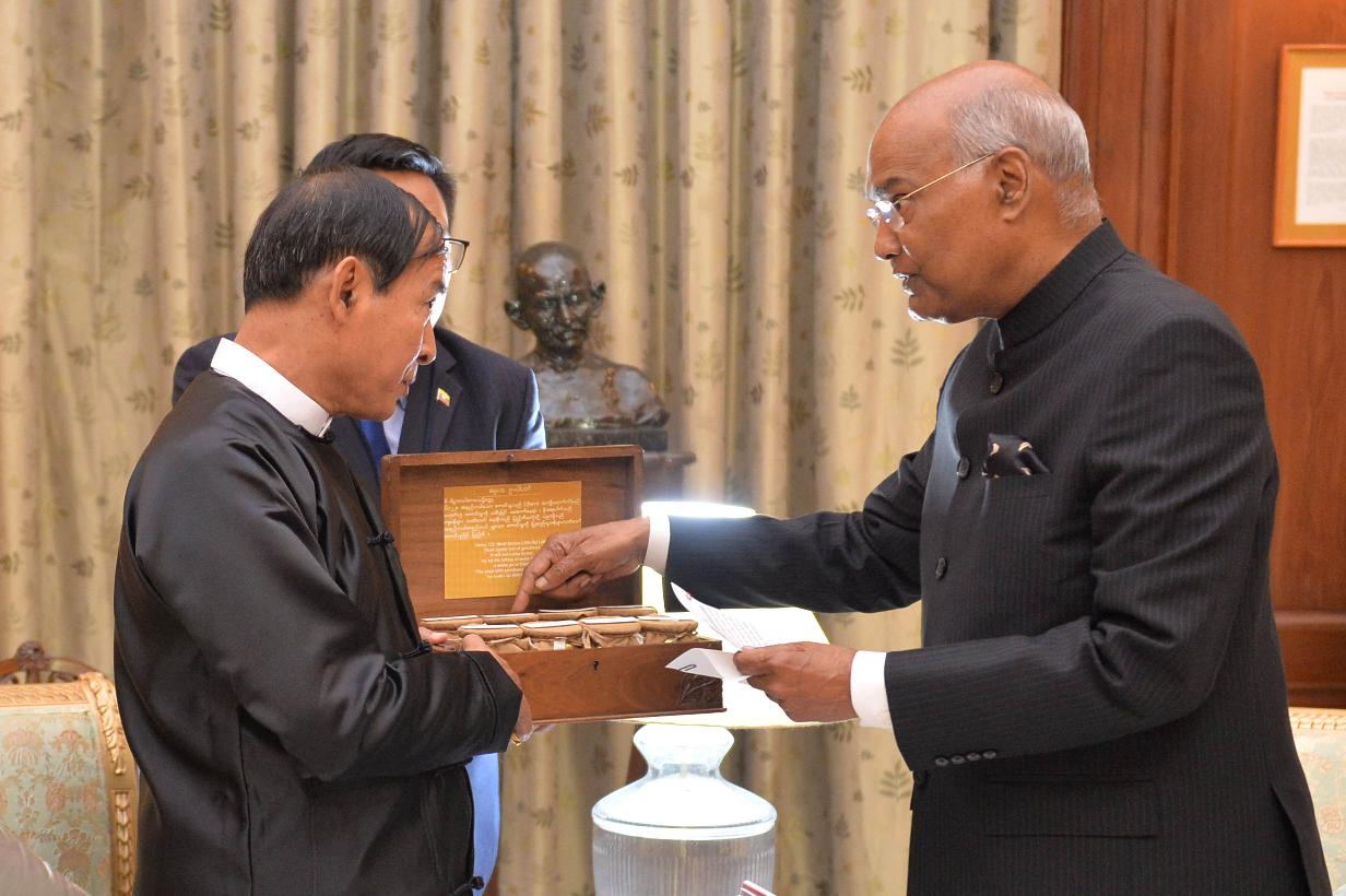 The President of India, Shri Ram Nath Kovind gifted holy soil from 8 cities connected with the life of Lord Buddha to the President of the Republic of the Union of Myanmar, H.E. Mr. U Win Myint, at Rashtrapati Bhavan on February 27, 2020.