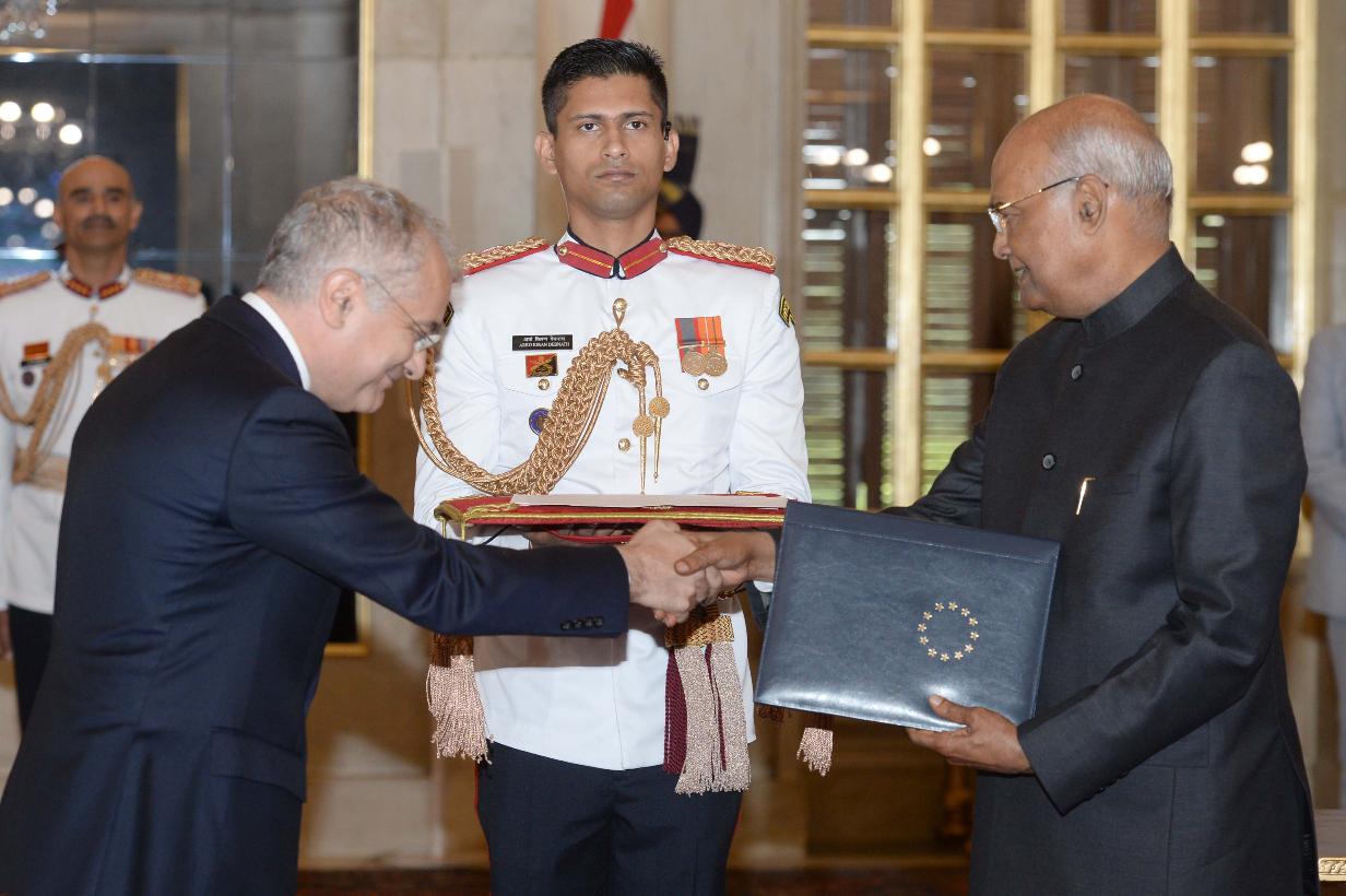 The Ambassador-designate of the European Union, H.E. Mr. Ugo Astuto presenting his credentials to the President of India, Shri Ram Nath Kovind, at Rashtrapati Bhavan on October 03, 2019.