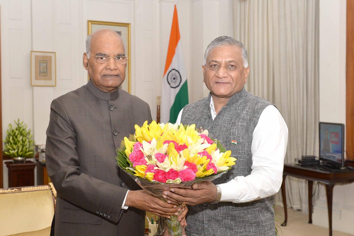 The Minister of State for External Affairs, General (Dr.) V.K. Singh (Retd) meeting with the President of India, Shri Ram Nath Kovind, at Rashtrapati Bhavan on September 19, 2018.