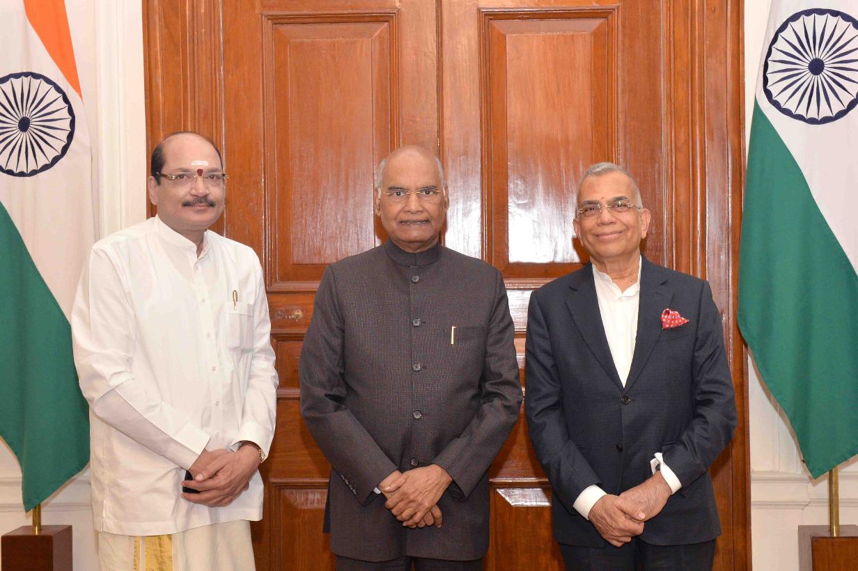 Shri Vijay Guru Jee and Shri PNC Menon meeting with the President of India, Shri Ram Nath Kovind, at Rashtrapati Bhavan on June 21, 2019.