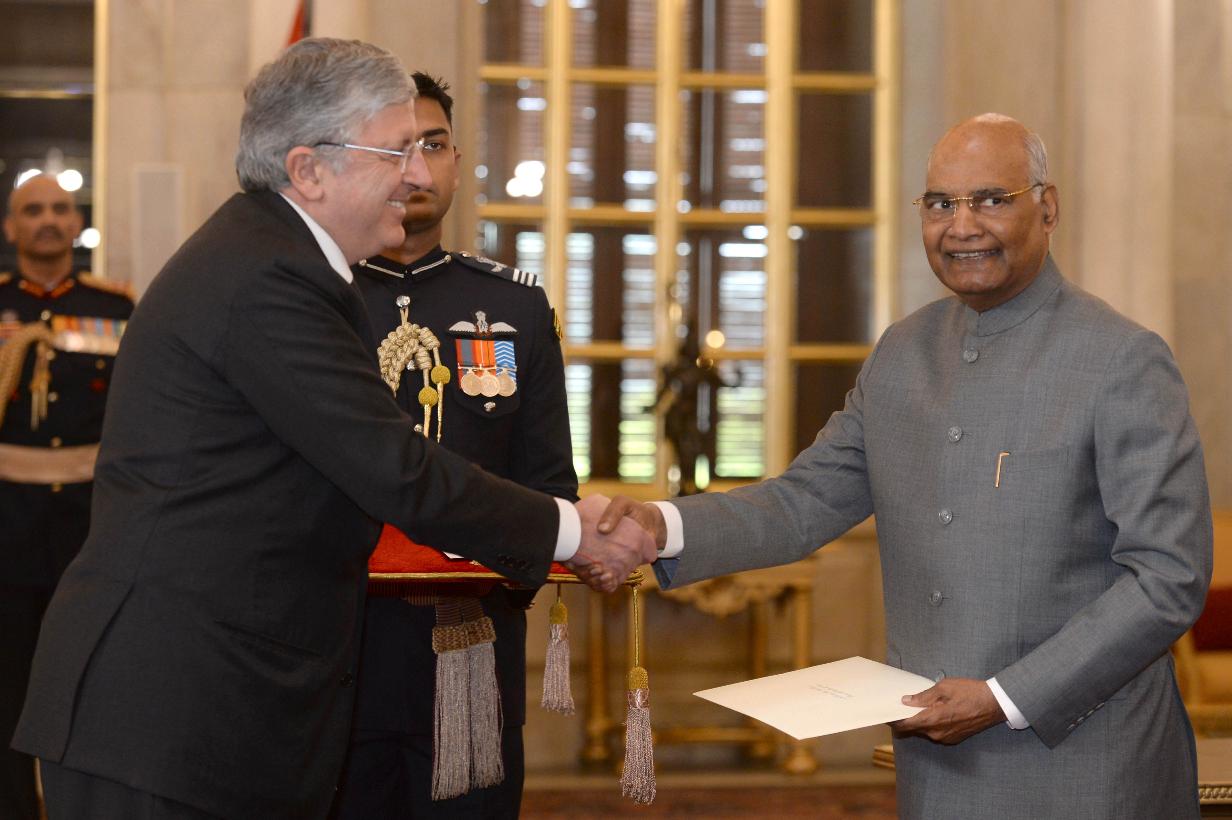 The Ambassador-designate of Italy, H.E. Mr. Vincenzo de Luca presenting his credentials to the President of India, Shri Ram Nath Kovind, at Rashtrapati Bhavan on December 18, 2019.