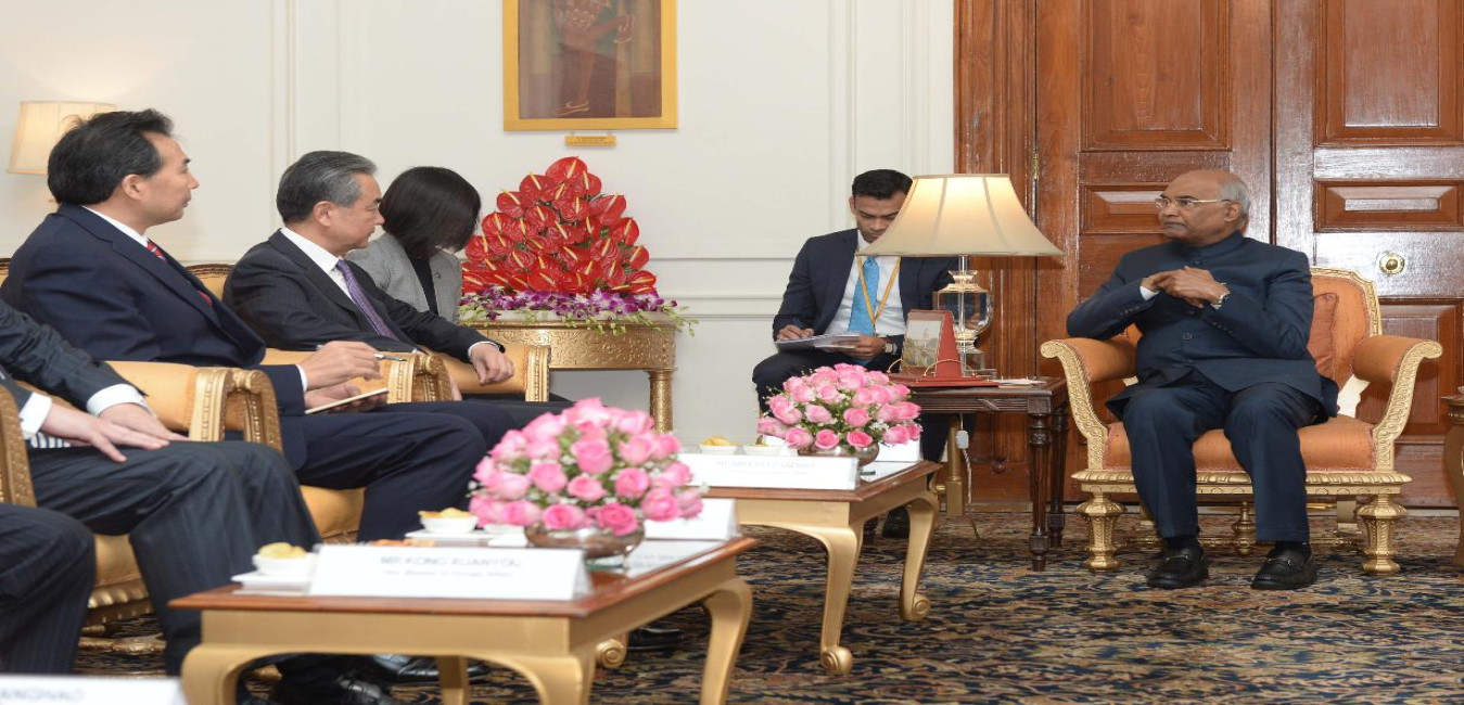 The Chinese State Councillor and Foreign Minister of People's Republic of China, H.E. Mr. Wang Yi calling on the President of India, Shri Ram Nath Kovind, at Rashtrapati Bhavan on December 21, 2018.