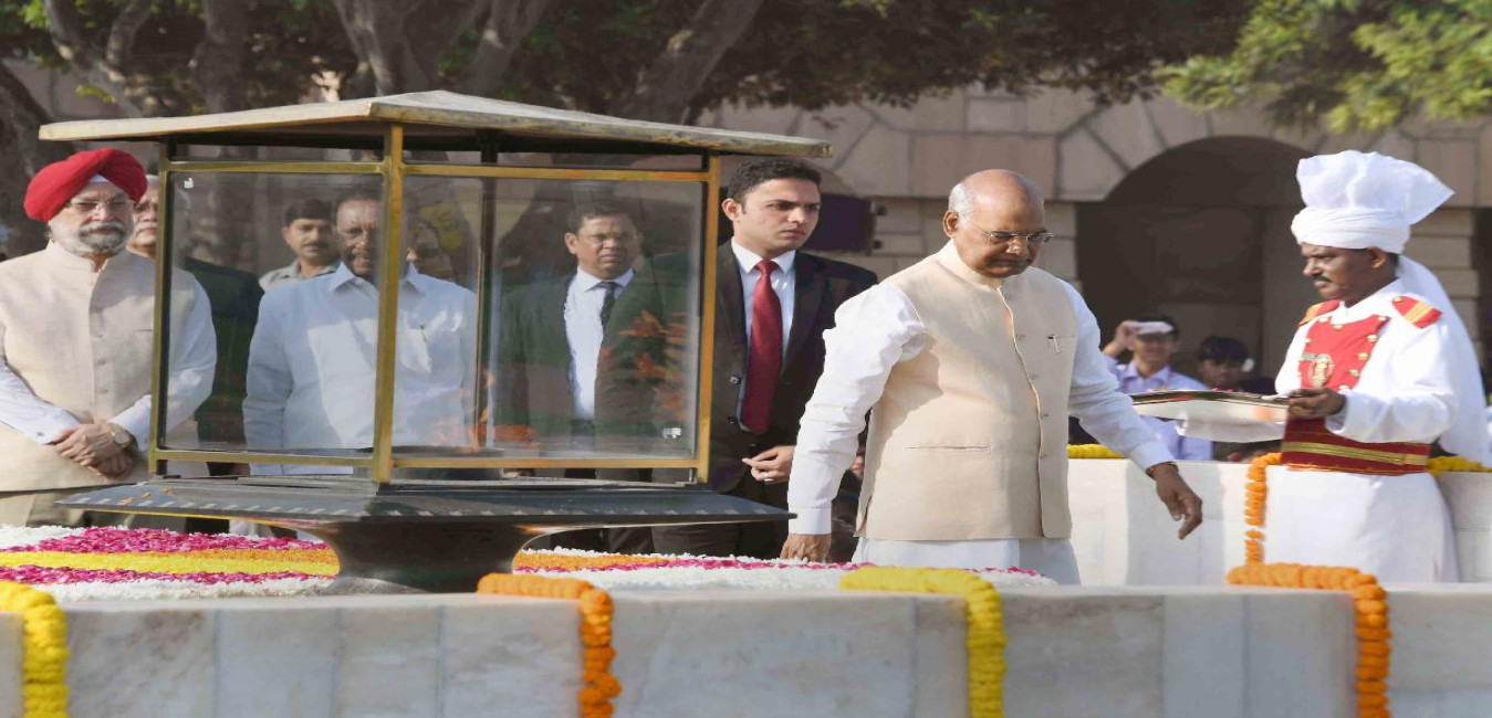 The President of India, Shri Ram Nath Kovind paying floral tributes at the Samadhi of Mahatma Gandhi on his 149th Birth Anniversary, at Rajghat, in New Delhi on October 02, 2018.