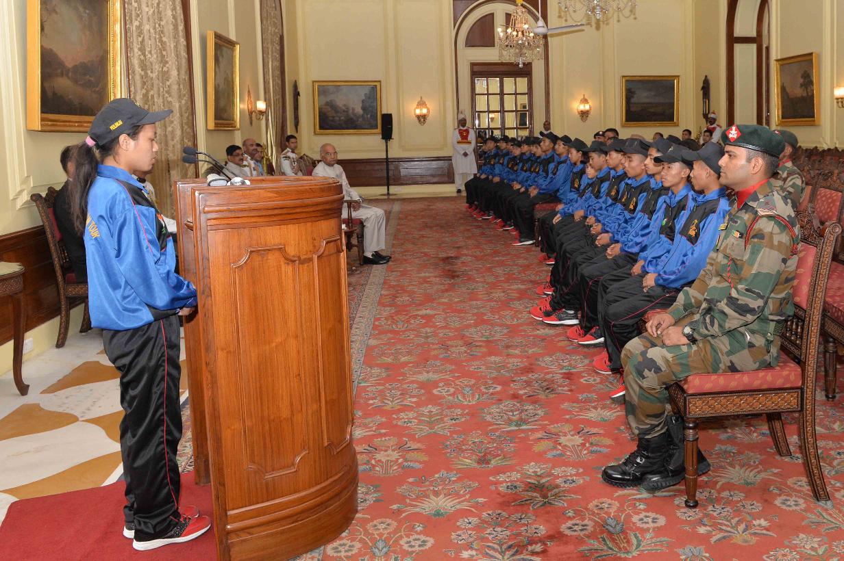 The President of India, Shri Ram Nath Kovind meeting with the students and teachers from Tamenglong, Manipur attending National Integration Tour (NIT), organised by the 23 Assam Rifles under the Aegis of HQ DG Assam Rifles, at Rashtrapati Bhavan on September 20, 2018.