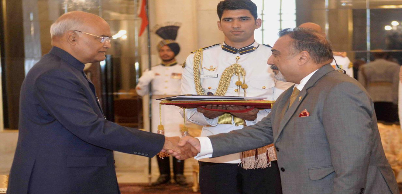 The High Commissioner-designate of the Republic of Fiji, H.E. Mr. Yogesh Punja presenting his credentials to the President of India, Shri Ram Nath Kovind, at Rashtrapati Bhavan on July 11, 2018.