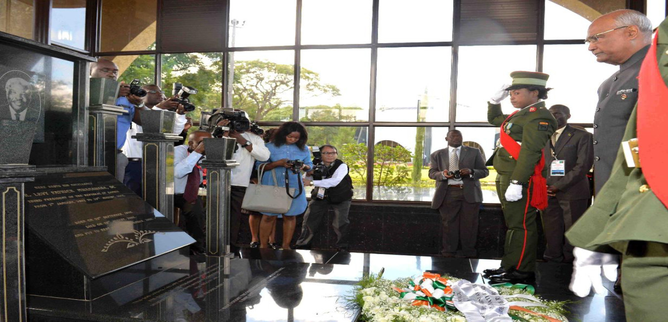 The President of India, Shri Ram Nath Kovind paying tributes to three former Presidents of Zambia Frederick Chiluba, Levy Mwanawasa and Micheal Sata, during his visit at Embassy Park Presidential Memorial, at Lusaka, in the Republic of Zambia on April 11, 2018.