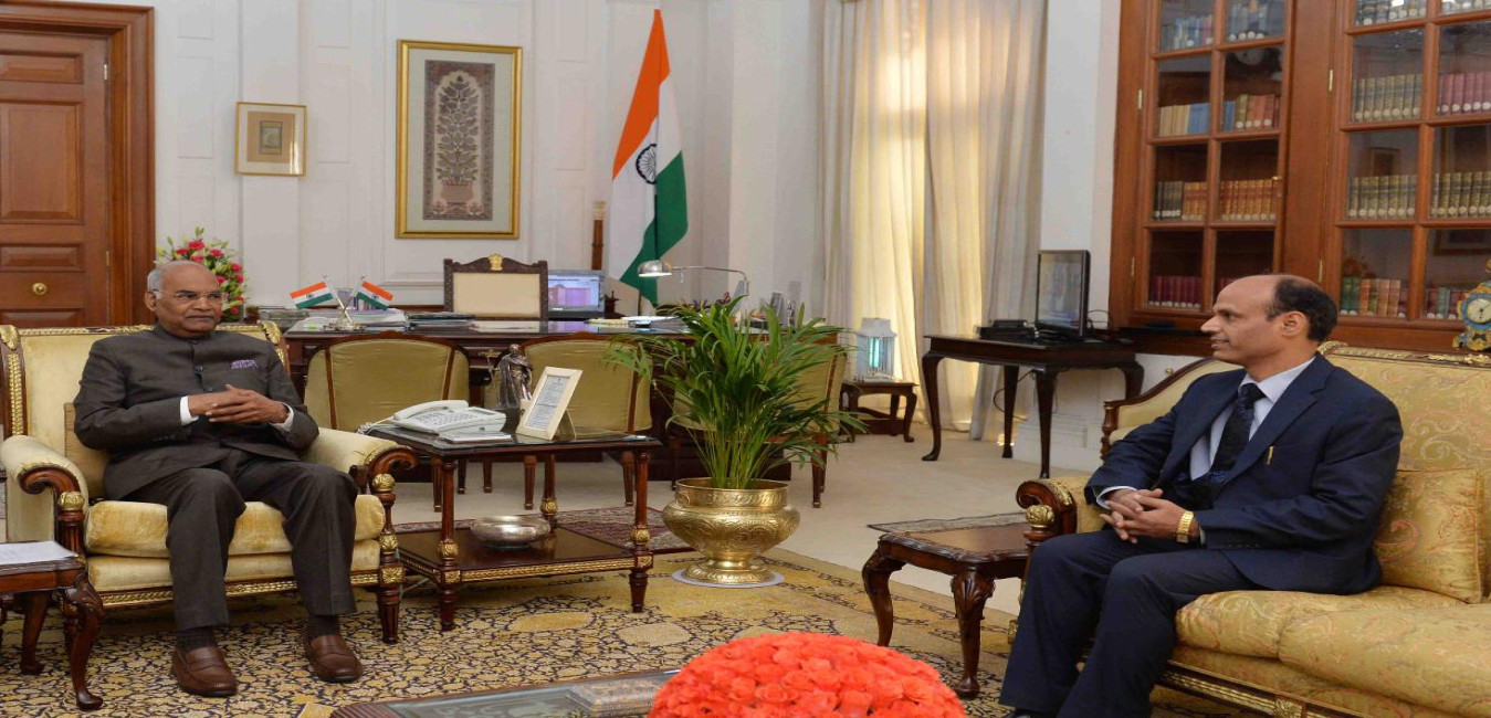 The High Commissioner-Designate of India to Botswana, Dr. Rajesh Ranjan meeting with the President of India, Shri Ram Nath Kovind, at Rashtrapati Bhavan on March 19, 2018.