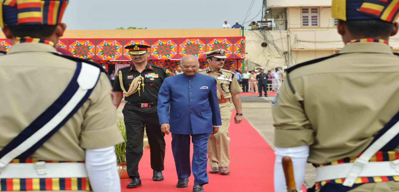 The President of India, Shri Ram Nath Kovind being received by the Governor, Odisha, Shri S.C. Jamir, the Chief Minister, Odisha, Shri Naveen Patnaik and the Union Minister for Petroleum & Natural Gas and Skill Development & Entrepreneurship, Shri Dharmendra Pradhan, on his ceremonial arrival, at Bhubaneswar, in Odisha on March 17, 2018.