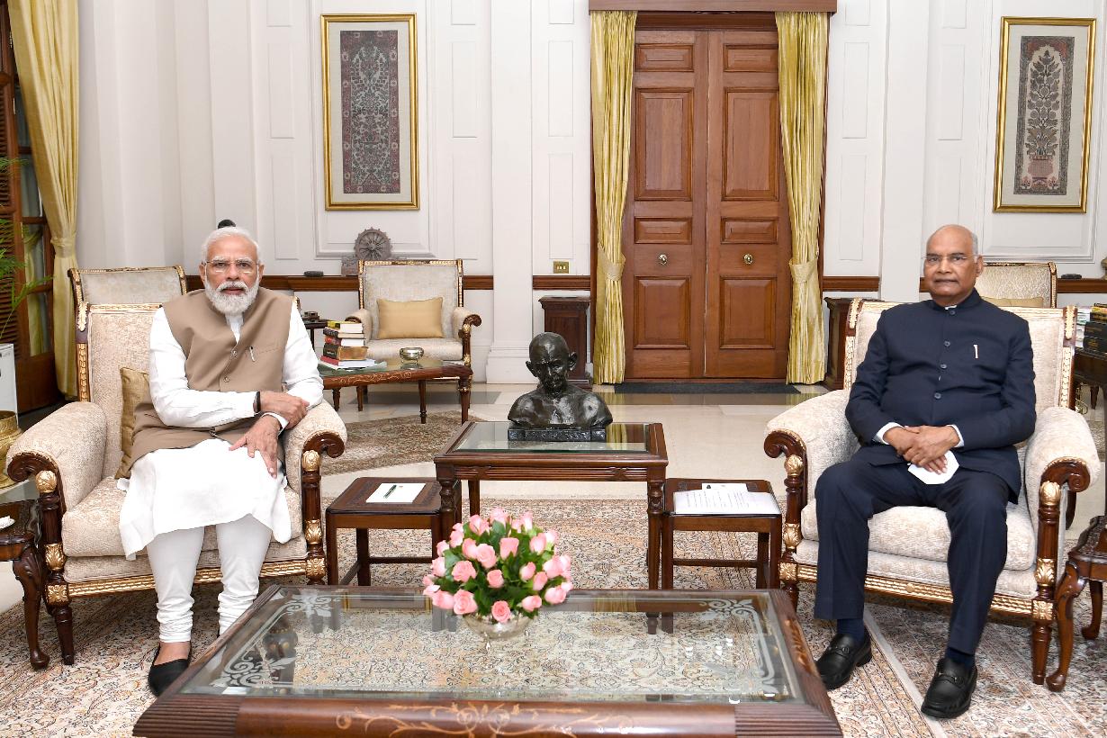 The Prime Minister of India, Shri Narendra Modi calling on the President of India, Shri Ram Nath Kovind, at Rashtrapati Bhavan on November 08, 2021.