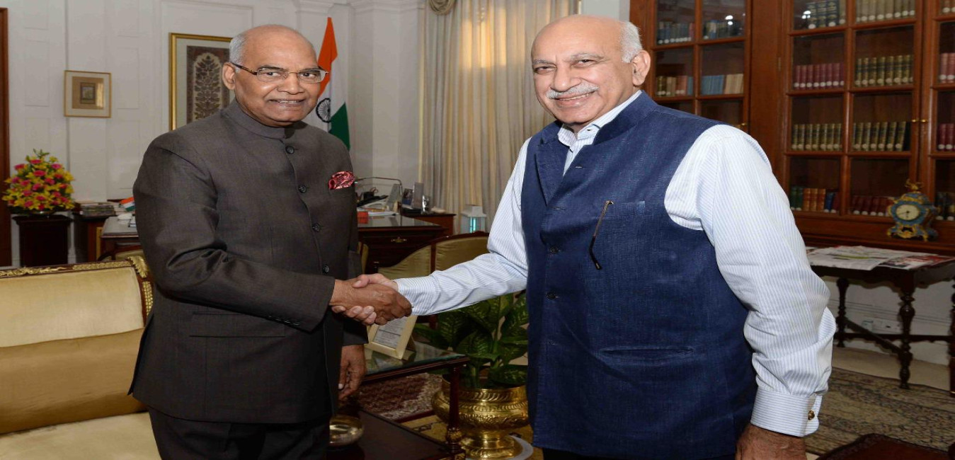 The Minister of State for External Affairs, Shri M. J. Akbar calling on the President of India, Shri Ram Nath Kovind, at Rashtrapati Bhavan on March 05, 2018.