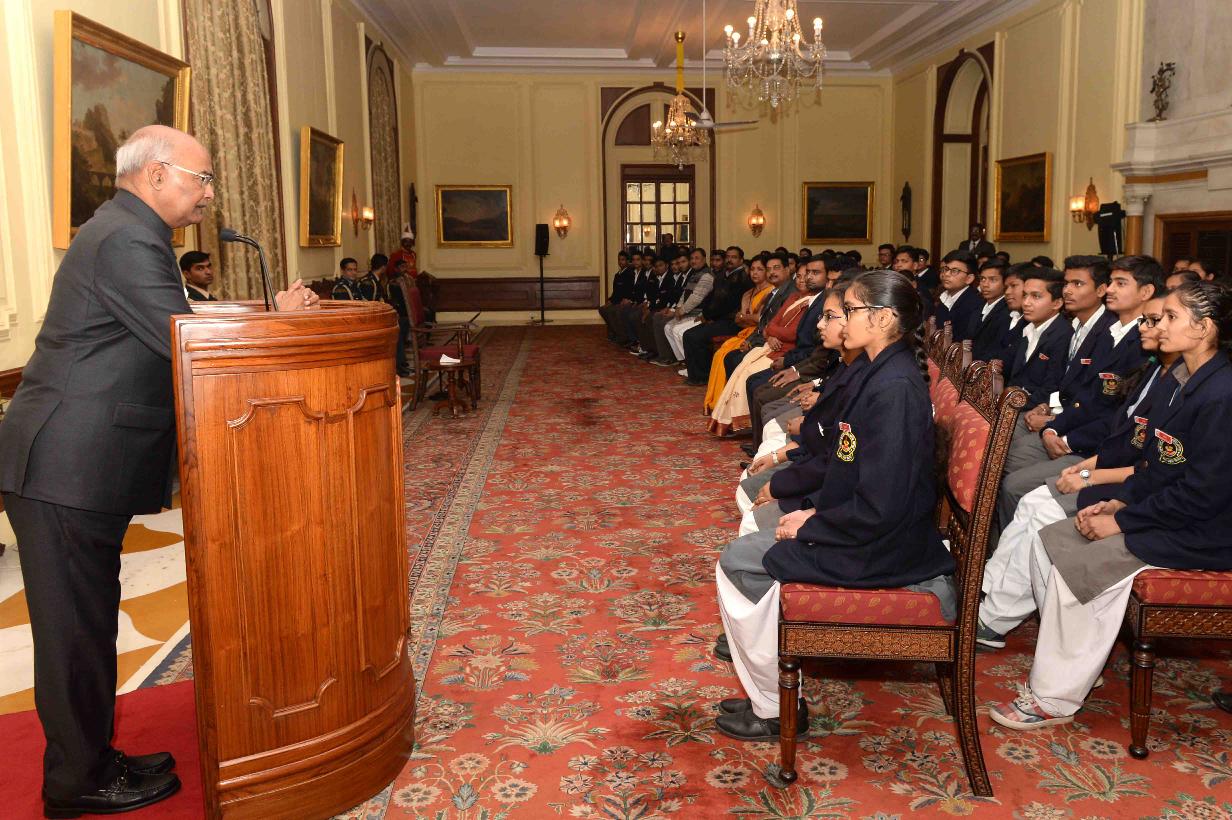 The President of India, Shri Ram Nath Kovind meeting with the students from Bishnupur, Manipur, attending National Integration Tour, organised by the 42 Assam Rifles, at Rashtrapati Bhavan on December 22, 2017.