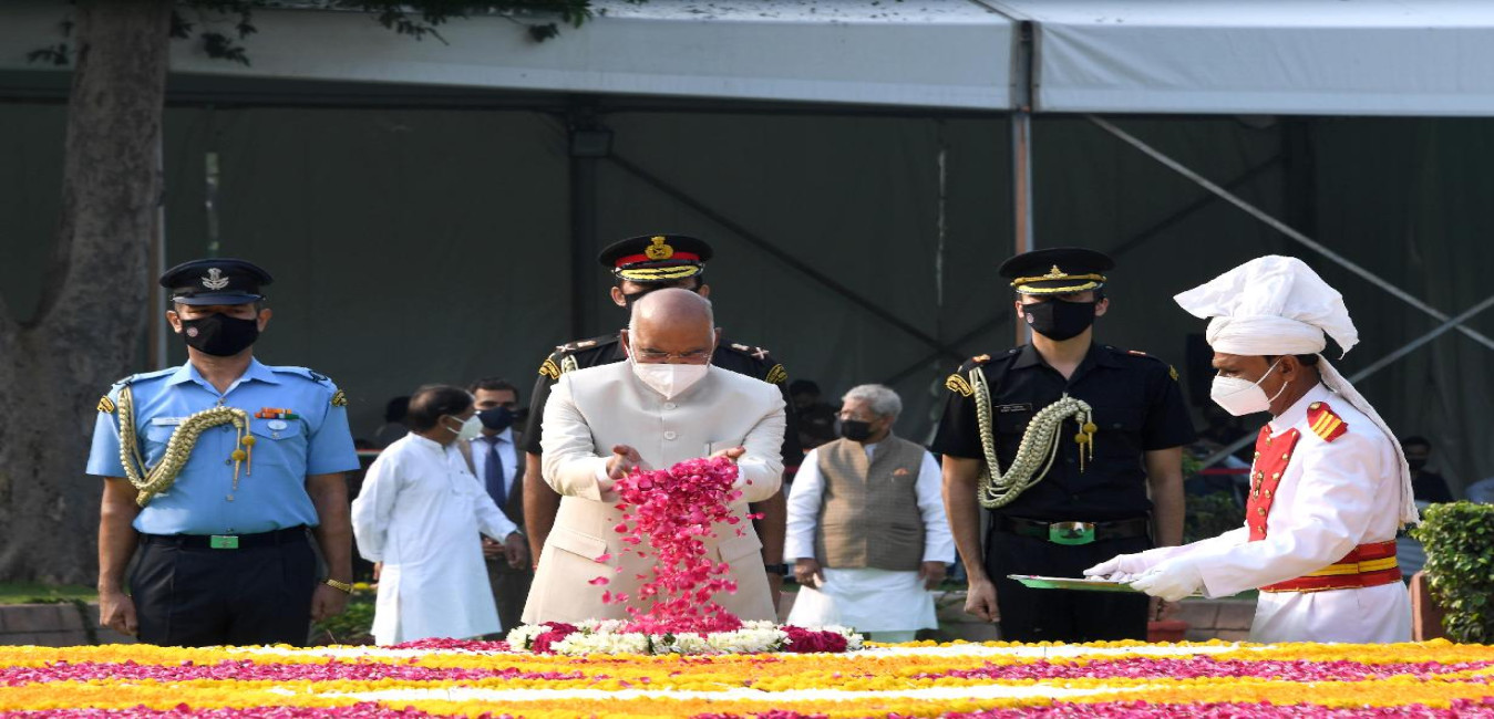 The President of India, Shri Ram Nath Kovind paying floral tributes to Mahatma Gandhi on his 152nd birth anniversary, at Rajghat, in New Delhi on October 02, 2021.
