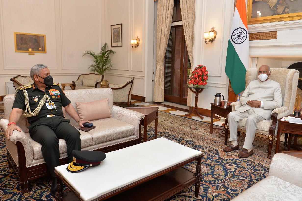 The Chief of Defence Staff, General Bipin Rawat calling on the President of India, Shri Ram Nath Kovind, at Rashtrapati Bhavan on October 05, 2021.