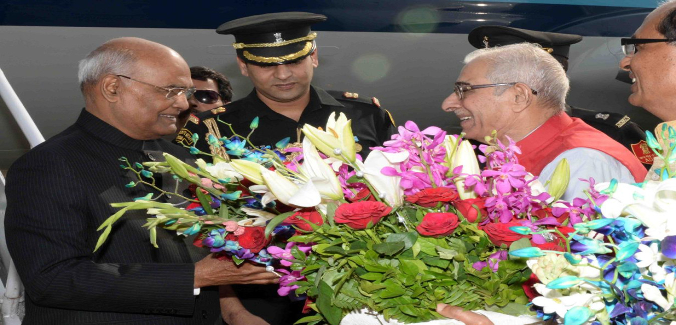 The President of India, Shri Ram Nath Kovind being received by the Governor of Madhya Pradesh, Shri Om Prakash Kohli and the Chief Minister of Madhya Pradesh, Shri Shivraj Singh Chouhan, on his arrival, at Bhopal airport, in Madhya Pradesh on November 10, 2017.