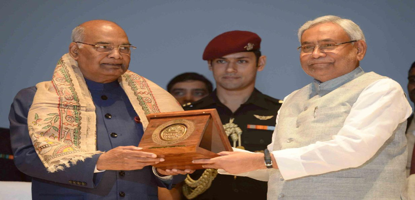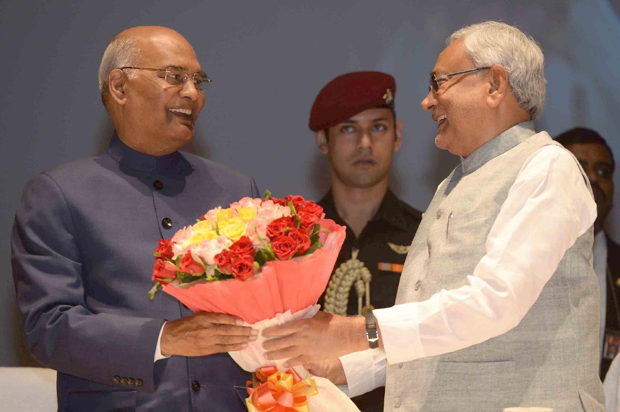 The Chief Minister of Bihar, Shri Nitish Kumar presenting the first copy of Agriculture Road Map Book & Mementoes to the President of India, Shri Ram Nath Kovind, at the launch of the Bihar Krishi Road Map 2017-2022, at Patna, in Bihar on November 09, 2017.