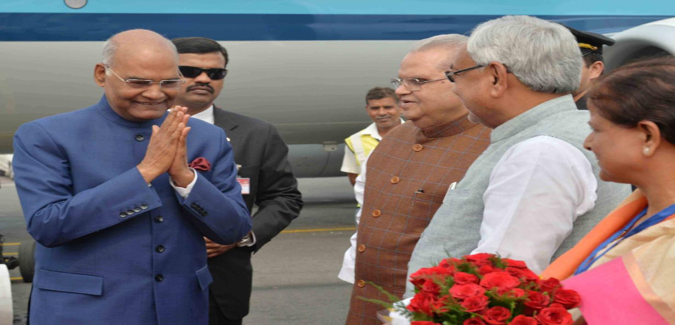 The President of India, Shri Ram Nath Kovind being received by the Governor of Bihar, Shri Satya Pal Malik and the Chief Minister of Bihar, Shri Nitish Kumar, on his arrival, at Patna airport, in Bihar on November 09, 2017.