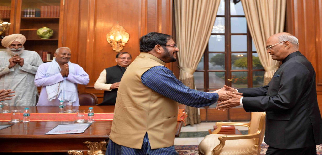 The Member, National Commission on Farmers & General Secretary, All India Kisan Sabha, Shri Atul Kumar Anjaan with others meeting with the President of India, Shri Ram Nath Kovind, at Rashtrapati Bhavan on November 08, 2017.