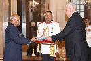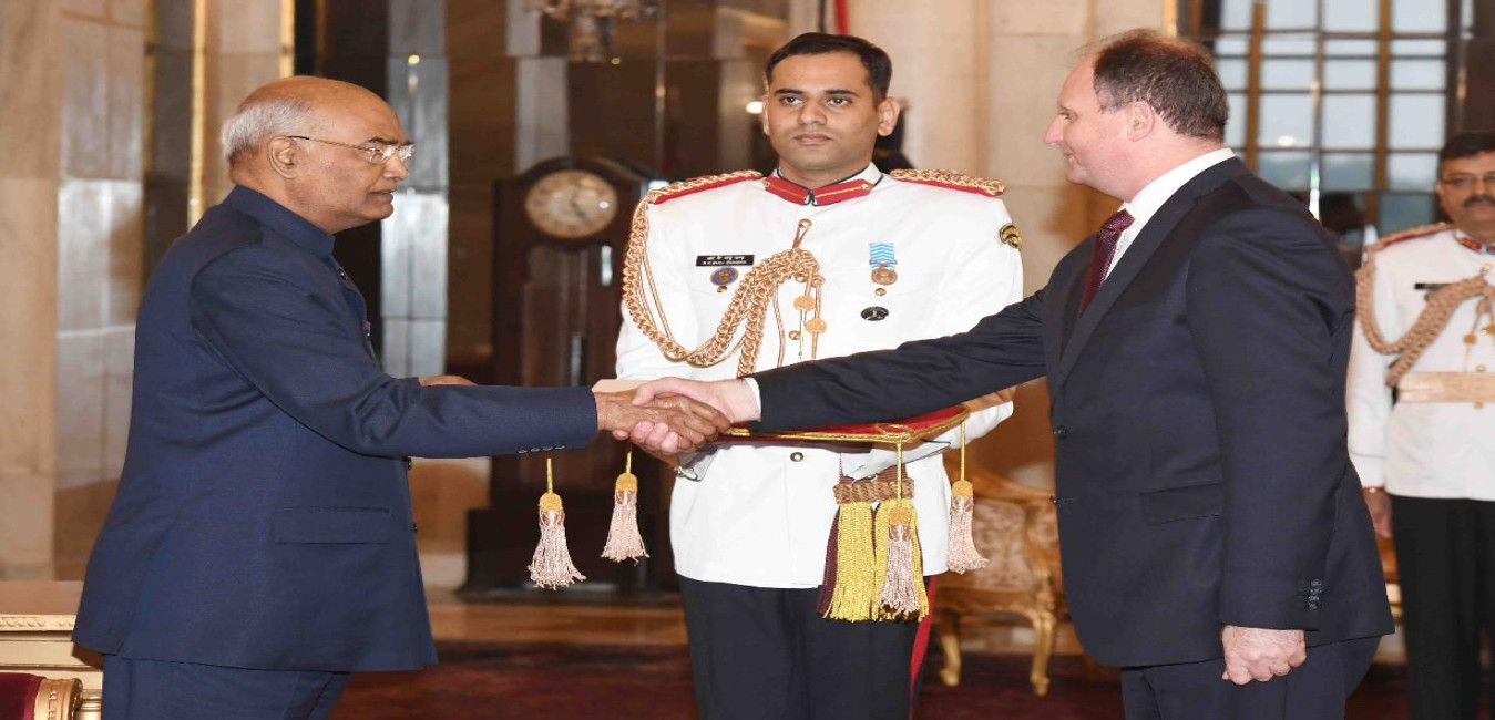 The Ambassador-designate of the Russian Federation, HE Mr. Nikolay Rishatovich Kudashev presenting his credentials to the President of India, Shri Ram Nath Kovind, at Rashtrapati Bhavan on October 26, 2017.