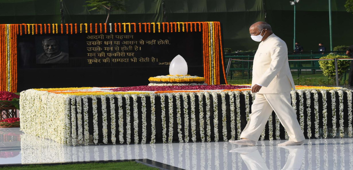 The President of India, Shri Ram Nath Kovind paying homage to Shri Atal Bihari Vajpayee, former Prime Minister of India, on his 3rd death anniversary, at Sadaiv Atal, in New Delhi on August 16, 2021.