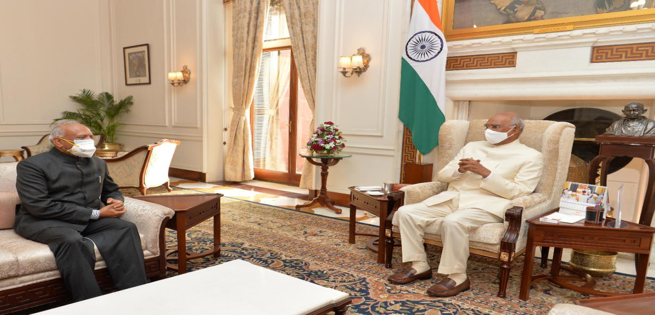 The Lt. Governor of Ladakh, Shri R.K. Mathur calling on the President of India, Shri Ram Nath Kovind, at Rashtrapati Bhavan on August 16, 2021.